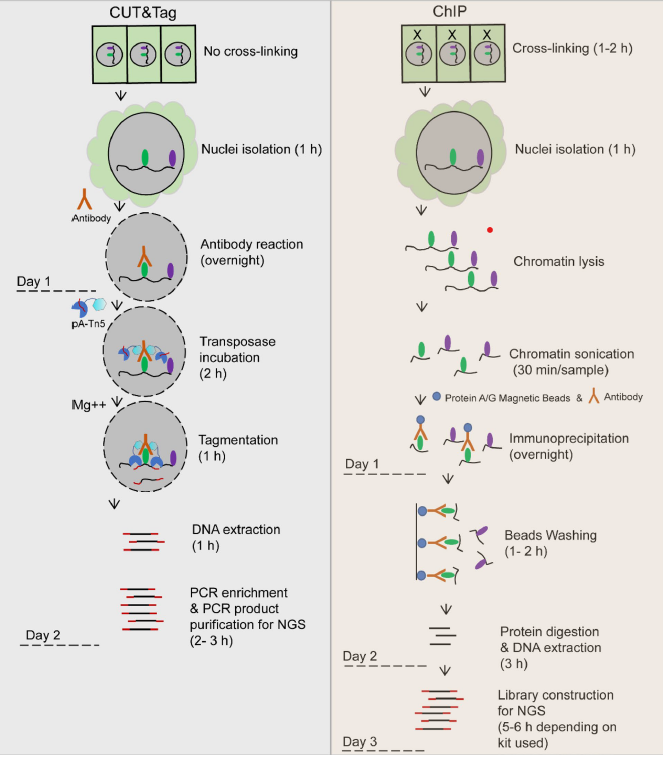 圖2 CUT&Tag與ChIP-Seq實(shí)驗(yàn)流程對(duì)比[2]