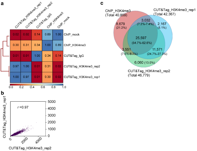 對(duì)CUT&Tag和ChIP數(shù)據(jù)進(jìn)行相關(guān)性分析,發(fā)現(xiàn)CUT&Tag的兩個(gè)生物學(xué)重復(fù)(CUT&Tag_H3K4me3_rep1和CUT&Tag_H3K4me3_rep2)與對(duì)照CUT&Tag_IgG相關(guān)性非常低(r=0.01,Pearson’s correlation),表明CUT&Tag實(shí)驗(yàn)組和對(duì)照組(背景噪音)存在顯著性差異(圖3,a),然而,ChIP_H3K4me3實(shí)驗(yàn)組與ChIP_mock具有很高的相關(guān)性(r=0.89,Pearson’s correlation),這表明,ChIP分析中信號(hào)-噪音比例很高(圖3,a),而CUT&Tag實(shí)驗(yàn)組的兩個(gè)生物學(xué)重復(fù)相關(guān)性近乎完美(r=0.97,Pearson’s correlation),說(shuō)明不同的生物學(xué)重復(fù)之間重復(fù)性非常好(圖3,b)。