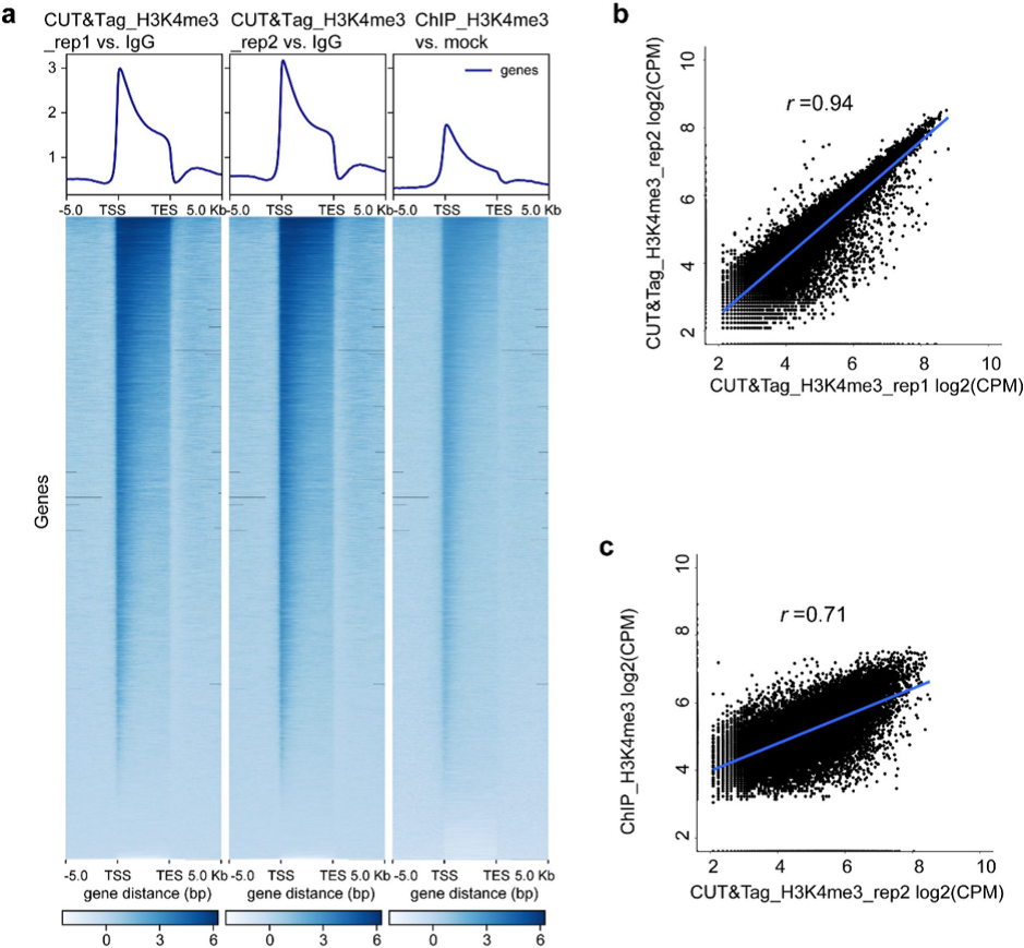 FRiP(fraction of reads in peaks)values calculated the ratio of mapped reads that fall into peaks among all mapped reads. FRiP值越高,信噪比越高,結(jié)果也越可靠。結(jié)果表明CUT&Tag產(chǎn)生的信噪比較高(FRiP=0.7;表1)。然而,從H3K4me3信號(hào)熱圖上可以看出,在整個(gè)gene body區(qū)域CUT&Tag的信號(hào)比ChIP-Seq更強(qiáng)(圖4,a)。從相關(guān)性分析的結(jié)果可以看出,基因附近的peaks在CUT&Tag兩個(gè)生物學(xué)重復(fù)之間相關(guān)性很高(r=0.94,pearson’s correlation;圖4,b),CUT&Tag和ChIP之間的相關(guān)性也較高(r=0.71,pearson’s correlation;圖4,c)。