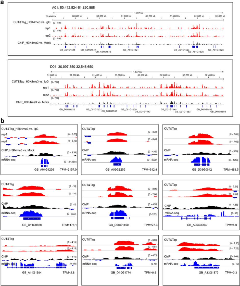 與熱圖顯示的強(qiáng)度一致,IGV截圖表明CUT&Tag信號(hào)在分辨率和靈敏度上的表現(xiàn)優(yōu)于ChIP(圖5,a),尤其在表達(dá)量相對(duì)低的基因中表現(xiàn)尤為明顯(如GB_A11G1394, GB_D10G1774, 和 GB_A13G1872;圖5,b)