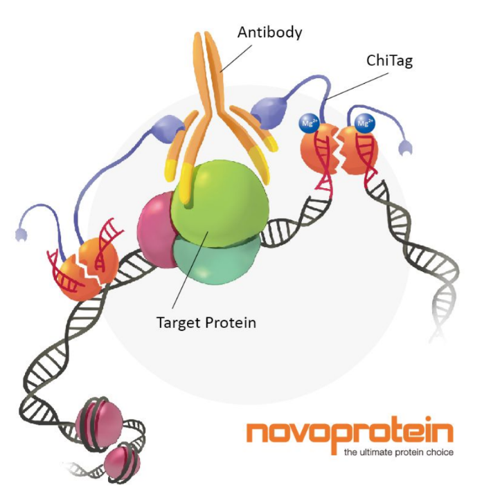 CUT&Tag使用Protein A與Tn5轉(zhuǎn)座酶的融合蛋白(ChiTag),在抗體的引導(dǎo)下,Protein A與染色質(zhì)上的目的組蛋白修飾標(biāo)記、轉(zhuǎn)錄因子或染色質(zhì)調(diào)控蛋白結(jié)合,連帶的Tn5轉(zhuǎn)座酶對(duì)目的蛋白附近的DNA序列進(jìn)行切割,并將測(cè)序接頭連接到切割片段的兩端(圖1),并釋放到細(xì)胞外,PCR擴(kuò)增后直接用于高通量測(cè)序。