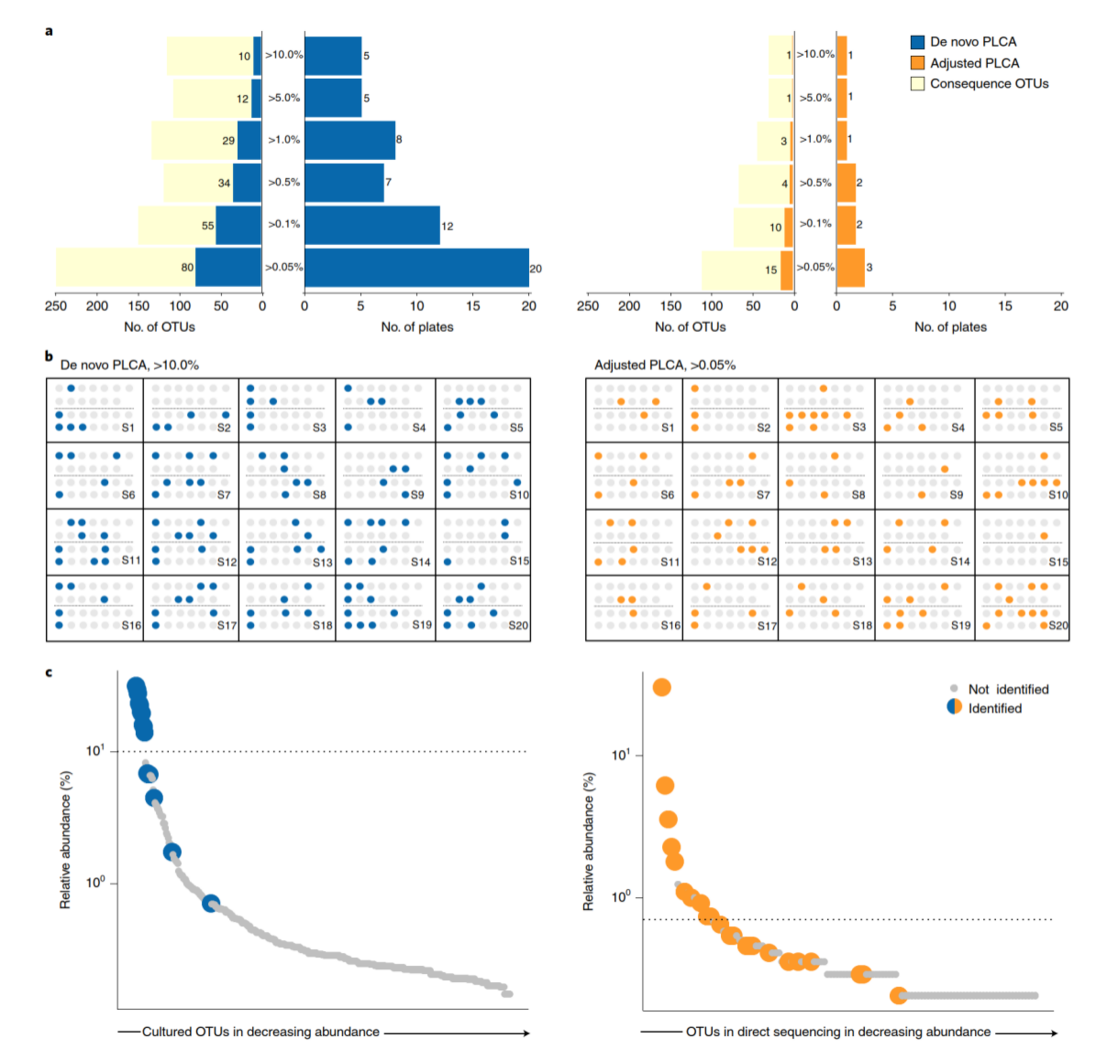 作者采用了PLCA算法,來決定需要進行富集培養(yǎng)宏基因組測序的最小樣品數(shù),算法對任何含有大部分可培養(yǎng)富集的菌群生態(tài)均適用。PLCA算法有兩個版本,從頭 PLCA不依賴于直接測序結果再現(xiàn)富集培養(yǎng)菌群,而校正PLCA側(cè)重于直接測序結果中OTU的修復,這取決于是否都對原始樣品的菌群組成感興趣。采用這兩種算法,數(shù)據(jù)集凸顯了不同樣本的獨特性:從頭PLCA顯示,每個樣本具有獨特的平板集,并且每個培養(yǎng)條件對每個樣本都是必要的;校正PLCA顯示對數(shù)據(jù)集中樣本進行富集培養(yǎng)宏基因組測序是很有必要的(圖4a,b)。