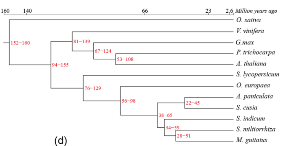 (10)分析中需要借助于化石時間矯正得到有分化時間的物種樹,因此需要進(jìn)化樹分支上某一物種具有化石信息,為了分析的準(zhǔn)確性,盡量能在每個大分支內(nèi)有一個化石信息。常用的化石信息查詢網(wǎng)站:TIMETREE website ?(http://timetree.org/)