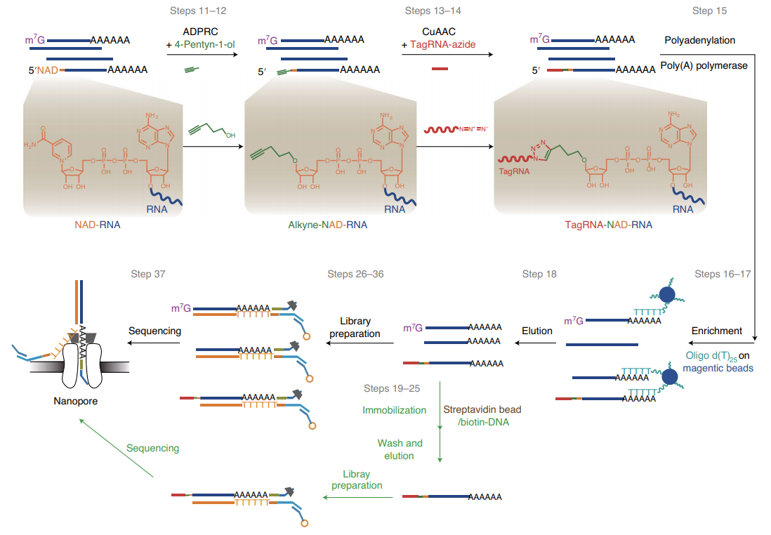 幾年前,開發(fā)了NAD captureSeq,用于NAD-RNA的轉(zhuǎn)錄組范圍分析。在NAD captureSeq中,腺苷二磷酸核糖基環(huán)化酶(ADPRC)用于將NAD +的煙酰胺部分替換為含炔烴的分子,稱為4-戊炔-1-醇。然后通過點擊化學(xué)反應(yīng)(銅催化的疊氮炔炔環(huán)加成(CuAAC))將炔基化產(chǎn)物與生物素疊氮化物連接。用鏈霉親和素樹脂富集生物素標(biāo)記的RNA,然后制備通過二代測序技術(shù)(NGS)測序的cDNA文庫。陰性對照RNA樣品的處理方法相同,但不使用ADPRC。如果與陰性對照相比,在ADPRC處理的樣品中富集了特定的RNA,則其某些轉(zhuǎn)錄本被認為是NAD +?capped。通過NAD captureSeq,已在細菌,酵母,植物和人類細胞中鑒定出NAD-RNA。缺點:非生物素化的RNA與鏈霉親和素樹脂的非特異性結(jié)合。由于NAD-RNA水平很低,因此非特異性結(jié)合可能會顯著降低敏感性并引入誤差。在生物素標(biāo)記過程中RNA的斷裂以及隨后cDNA文庫的構(gòu)建導(dǎo)致NAD-RNA總體序列結(jié)構(gòu)信息的丟失。