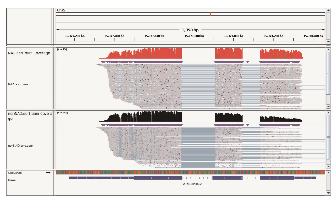 從TagSeek步驟生成的帶標(biāo)簽和不帶標(biāo)簽的reads可以接受TagSeqQuant,它使用Minimap2的默認比對參數(shù)。在TagSeqQuant中,還通過FastQC對reads進行質(zhì)量檢查,并生成一個html文件以顯示測序質(zhì)量。經(jīng)過上述分析步驟后,將生成NAD-RNA和非NAD-RNA的基因覆蓋文件,以進行IGV可視化(圖3),并生成基因和isoforms的計數(shù)表以進行進一步分析。