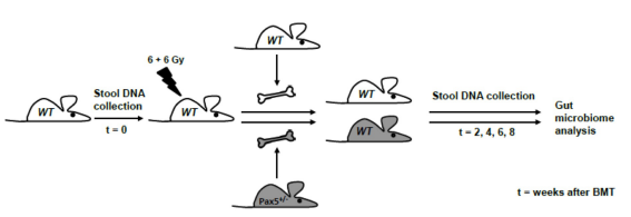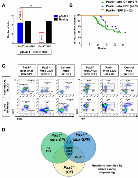 我們考慮了在SPF條件下腸道生理性微生物群的作用,以及在沒有自然感染誘因的情況下,通過細菌枯竭來改變它是否會導致白血病的發(fā)生。為了測試這一點,另外一組出生在SPF的23只Pax5+/-小鼠沒有被轉(zhuǎn)移到CF,而是在整個實驗過程中一直保持在SPF中。這些小鼠接受抗生素治療。