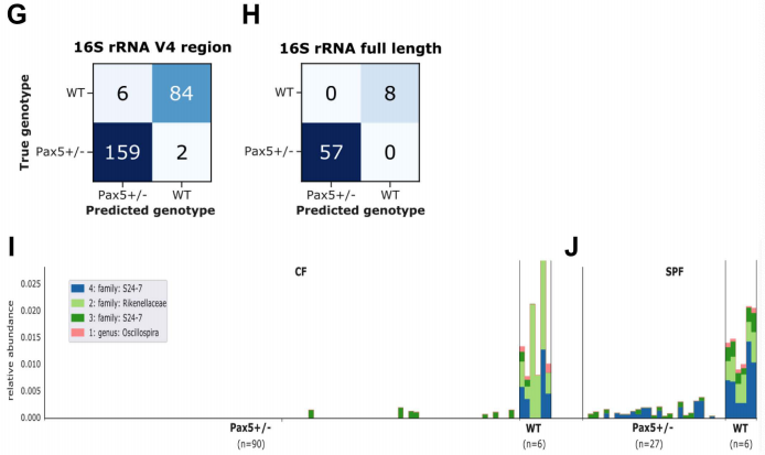 我們通過獨立地將機器學習方法應用于3983個ASV,進一步將基因型分離ASV的集合細化到只有40個。ASV根據(jù)特征重要性進行排序,由“隨機森林”算法確定,41個ASV用50%的樣本進行訓練,并在剩余50%的樣本上進行測試。這40個ASV足以準確(96.8%)預測小鼠基因型(圖1G)。事實上,這種機器學習工具能夠預測小鼠的基因型,這證實了Pax5雜合性形成了特定的腸道微生物群落。值得注意的是,16S rRNA全長測序使我們僅使用5212個全長ASV中的4個,就進一步提高了Pax5+/-和WT動物之間的基因型預測的準確性,準確率達到100%(圖1H)。WT和Pax5+/-小鼠微生物群的主要區(qū)別在于Pax5+/-小鼠缺乏完整的共生菌。具體地說,在WT小鼠中可以檢測到的Rikenellaceae、S24-7和Oscillospira屬的成員在CF的Pax5+/-小鼠的微生物群落中缺失(圖1I)。在SPF中,在Pax5+/-小鼠的微生物群落中沒有檢測到Rikenellaceae和Oscillospira屬的成員(圖1J)。