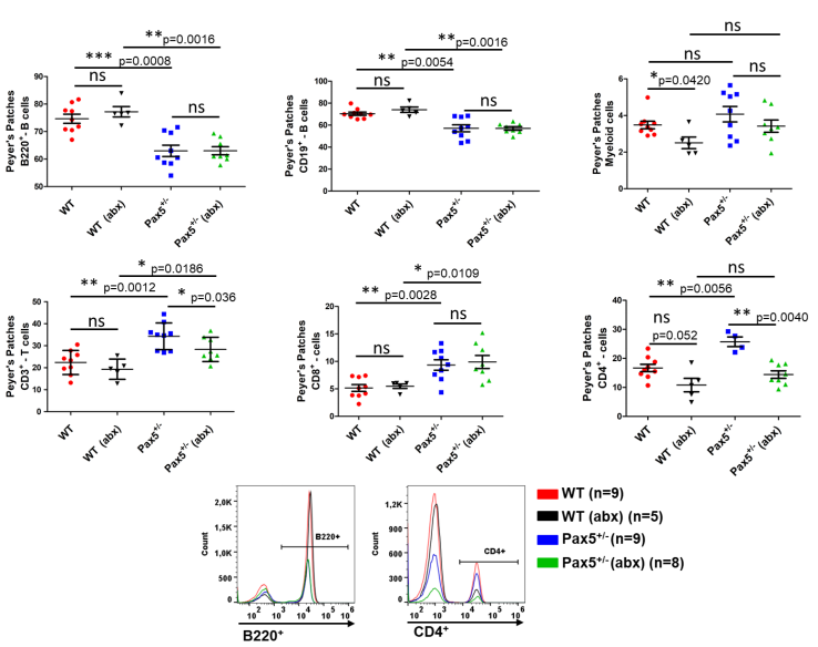 我們設(shè)立了第二個小鼠隊列,命名為“ABX”,并用抗生素治療這些小鼠以清除細菌。這個隊列由27只Pax5+/-和18只WT小鼠組成,我們在轉(zhuǎn)移時(在服用抗生素之前)、抗生素治療后4周和8周收集糞便顆粒,然后每兩周收集一次,直到一只小鼠出現(xiàn)明顯的PB-ALL癥狀或達到其自然壽命的終點。通過微生物分析、糞便DNA濃度分析和16S rRNA擴增序列測定(圖S7),證實了抗生素雞尾酒的殺菌效果。在抗生素治療期間從小鼠身上收集的糞便樣本主要包含來自它們植物性飲食的Read(平均82%的Read可以歸類為葉綠體或線粒體來源)。當我們分析抗生素治療對不同器官造血室的影響時,我們觀察到抗生素治療并不改變WT或Pax5+/-小鼠的B細胞發(fā)育。然而,在抗生素治療后,我們觀察到Pax5+/-小鼠外周血中成熟B細胞的減少,但未觀察到WT小鼠中成熟B細胞的減少。