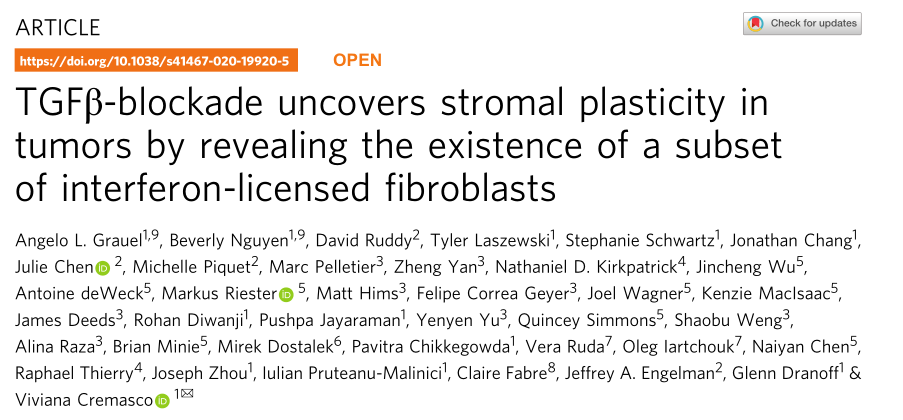 總之,這些數(shù)據(jù)表明,TGFβ-阻斷可導(dǎo)致小鼠和人類腫瘤成纖維細(xì)胞的重塑,暴露了一種獨(dú)特的CAF群體的誘導(dǎo),其特征是對IFN的明顯反應(yīng)和相當(dāng)大的免疫調(diào)節(jié)潛能。