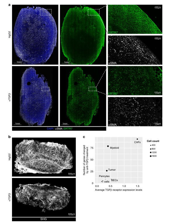 根據(jù)觀察到的基因表達(dá)變化,作者利用冷凍保存的腫瘤從同型或抗tgfβ處理小鼠切片,染色和共聚焦顯微鏡成像等方法確定了TGFβ-阻斷是否對構(gòu)成腫瘤建筑框架結(jié)構(gòu)產(chǎn)生損傷。Acta2表達(dá)的鏡像變化,肌成纖維細(xì)胞網(wǎng)絡(luò)的顯著改變,細(xì)長的紡錘形細(xì)胞稀少等揭示了瘤內(nèi)結(jié)構(gòu)組織的顯著變化,表明TGFβ阻斷抗體處理小鼠的高網(wǎng)狀纖維網(wǎng)絡(luò)丟失(圖3a)。通過對全器官的斷層掃描,進(jìn)一步證實(shí)了膠原骨架形成的整體損傷,如圖3b所示。單細(xì)胞RNAseq分析結(jié)果表明基因的數(shù)量受anti-TGFβ治療明顯更大 (圖3 c),也與先前的結(jié)果一致。