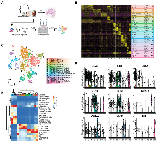 我們觀察到3個非免疫細(xì)胞簇(簇8,9和10;表達(dá)CD34和ACTA2[肌動蛋白α2,平滑肌])和11個白細(xì)胞簇(圖1B和1D)。后者包括5個淋巴細(xì)胞簇(第0、1、3、4、11簇;表達(dá)CD3E、CD4、CD8、CD79A),5個髓系簇(第5、6、7、12和13簇;表達(dá)CD14、CD68、KIT),和1個沒有明確的細(xì)胞類型表達(dá)譜的混合細(xì)胞的簇(第2簇),但與其他簇有相似的基因表達(dá),似乎主要含有凋亡的髓系細(xì)胞和T細(xì)胞(圖1B和1D)。T細(xì)胞是我們數(shù)據(jù)集中豐富的群體,占所有分析細(xì)胞的52.4%,而髓系群體占所有細(xì)胞的18.5%。