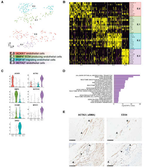 EC簇之間的聚集以及SMC相關(guān)通路的富集(圖2D),表明這個亞群可能正在經(jīng)歷內(nèi)皮細(xì)胞向間充質(zhì)細(xì)胞的轉(zhuǎn)變,或者反之亦然。為了驗證這些發(fā)現(xiàn),我們觀察了ACTA2和CD34在連續(xù)的組織學(xué)切片上的表達(dá)(圖2E)。
