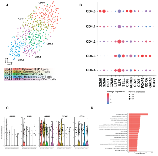 為了更詳細(xì)地定義T細(xì)胞,我們分離和重新聚類CD4+T細(xì)胞,發(fā)現(xiàn)了5個亞類(CD4.0-CD4.4,圖3A),其中主要的區(qū)別是它們的激活狀態(tài),而不是通常用于定義CD4+T輔助亞群的轉(zhuǎn)錄因子和細(xì)胞因子(圖3B和3C)。CD4.0和CD4.1具有細(xì)胞毒基因表達(dá)譜,此外,這一簇中的基因表達(dá)證實了與適應(yīng)性免疫反應(yīng)相關(guān)的促炎通路的富集(圖3D)。