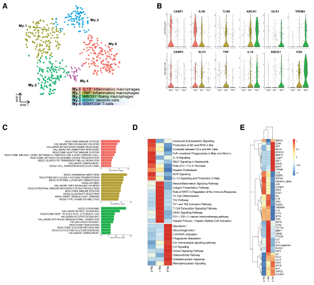 我們分離和重新聚類動脈粥樣硬化性髓系細(xì)胞,揭示了5種不同的表型(My.0-My.4,圖4A)。My.0、My.1和My.2很可能代表不同激活狀態(tài)的巨噬細(xì)胞。促炎標(biāo)志物基因(圖4B)以及免疫和炎癥通路的富集結(jié)果(圖4C)表明,My.0和My.1亞類由促炎巨噬細(xì)胞組成。My.0顯示了最近招募的巨噬細(xì)胞的特征(圖4C,D),表明共表達(dá)的炎癥體被激活(圖4B)。與My.0和My.1相比,My.2缺乏明顯的促炎標(biāo)志物,并顯示巨噬細(xì)胞和泡沫細(xì)胞的跡象。