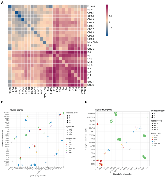 隨后,我們按髓系配體(圖5B)和受體(圖5C)明確地檢查了髓系群體中獨特的相互作用。發(fā)現(xiàn)了多種趨化作用,包括內(nèi)皮ACKR1與髓系來源的CCL2、CXCL8、CCL8和CXCL1的相互作用,其中最后兩個配體在My.1中特異性表達(dá)。我們還觀察到在所有髓系亞群中的CSF1R,與在內(nèi)皮細(xì)胞、平滑肌細(xì)胞、肥大細(xì)胞和髓系細(xì)胞中的CSF1有相互作用。