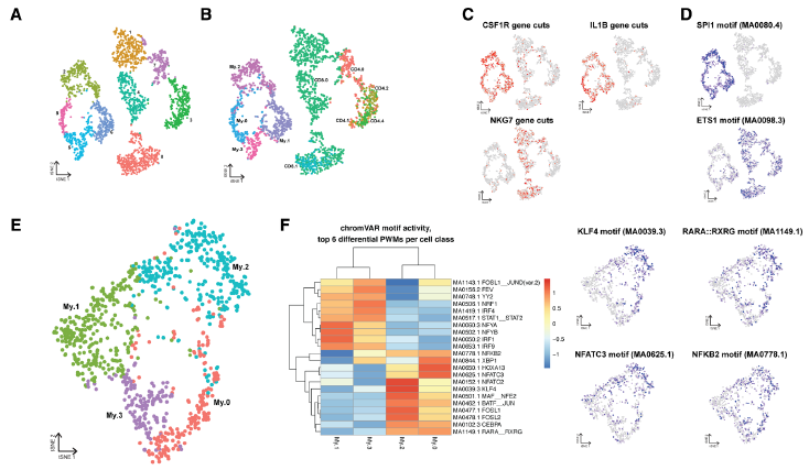 利用scATAC-seq,我們檢測了人類斑塊中髓系和T細(xì)胞的開放染色質(zhì)啟動子和增強子圖譜。我們用scATACseq鑒定了4個髓系細(xì)胞簇和5個T細(xì)胞簇 (圖6A和6B)。巨噬細(xì)胞(CSF1R,IL1B)和T細(xì)胞特異性基因(NKG7)的開放染色質(zhì),以及巨噬細(xì)胞和T細(xì)胞(SPI155和ETS156)的細(xì)胞型TFs的motif的富集,明確了細(xì)胞類型之間的劃分界限(圖6C和6D)。轉(zhuǎn)移的髓系群體被重新聚類,類似于scRNA-seq簇(圖6E)。