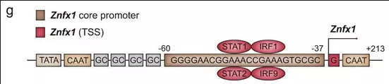 為了確定哪些核苷酸和區(qū)域Znfx1轉(zhuǎn)錄中很重要,使用promoter 2.0( http://www.cbs.dtu.dk/services/promoter/)、JASPAR(http://jaspar.genereg.net/)和CpGplot(http://www.ebi.ac.uk/Tools/seqstats/emboss_cpgplot/)進(jìn)行識(shí)別,其中包含TATA框、GC框和CAAT框的Znfx1的-1,064~+63之間的區(qū)域,是啟動(dòng)子。對(duì)轉(zhuǎn)錄因子結(jié)合位點(diǎn)的進(jìn)一步分析表明,Znfx1的啟動(dòng)子在相對(duì)集中和重疊的區(qū)域中包含STAT1、STAT2、IRF1和IRF9結(jié)合基序?;谶@些分析,構(gòu)建了一個(gè)Znfx1啟動(dòng)子報(bào)告基因載體,包含?1,064~+63之間的區(qū)域,以及一個(gè)突變的報(bào)告基因構(gòu)建體,其中缺失了STAT1、STAT2、IRF1和IRF9結(jié)合motif。接下來,STAT1,STAT2,IRF1或IRF9過表達(dá)質(zhì)粒和2個(gè)報(bào)告基因載體轉(zhuǎn)染293T細(xì)胞,報(bào)告基因分析表明,在STAT1、STAT2、IRF1或IRF9存在的情況下,報(bào)告基因的表達(dá)可以由Znfx1啟動(dòng)子誘導(dǎo),而不能由缺少轉(zhuǎn)錄因子結(jié)合位點(diǎn)的啟動(dòng)子載體誘導(dǎo)(圖1l)??偠灾琙NFX1是一個(gè)ISG,其病毒感染后的上調(diào)取決于JAK1-STAT1級(jí)聯(lián)反應(yīng)。