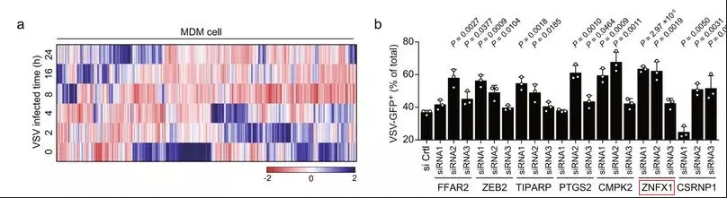 作者首先分析了他們先前發(fā)表的被水皰性口炎病毒(VSV)感染的單核細(xì)胞衍生巨噬細(xì)胞(MDM)的IVT-SAPAS(in vitro transcription-sequencing alternative polyadenylation sites)數(shù)據(jù),并發(fā)現(xiàn)了許多表達(dá)改變的基因?!局耙寻l(fā)表文章的數(shù)據(jù)重新挖掘】通過比較受VSV感染的人MDM數(shù)據(jù)和小鼠腹膜巨噬細(xì)胞數(shù)據(jù),發(fā)現(xiàn)了一些共同的基因,它們被上調(diào)了三倍以上,包括FFAR2,ZEB2,TIPAP,PTGS2,CMPK2,ZNFX1和CSRNP1。隨后敲除A549細(xì)胞中的這些基因,用VSV-eGFP(VSV-增強(qiáng)型綠色熒光蛋白)感染細(xì)胞,流式細(xì)胞術(shù)檢測(cè)GFP陽性細(xì)胞的百分比表明,敲減ZNFX1(其抗病毒作用尚未見報(bào)道)促進(jìn)了VSV感染。