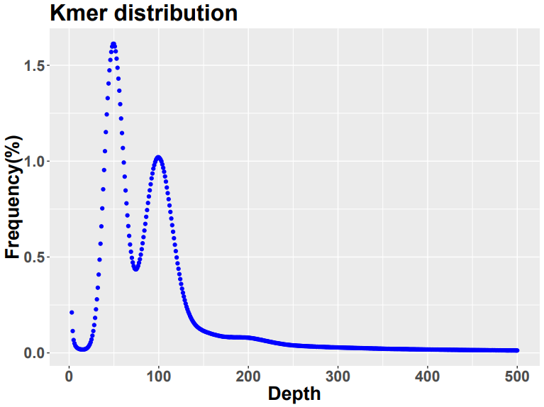 Figure 1,一個二倍體的kmer頻率-深度分布圖,橫軸為深度,縱軸為kmer出現(xiàn)的頻率,主峰位于深度100左右,雜合峰位于深度50左右