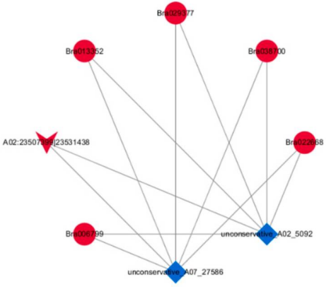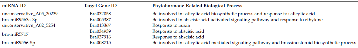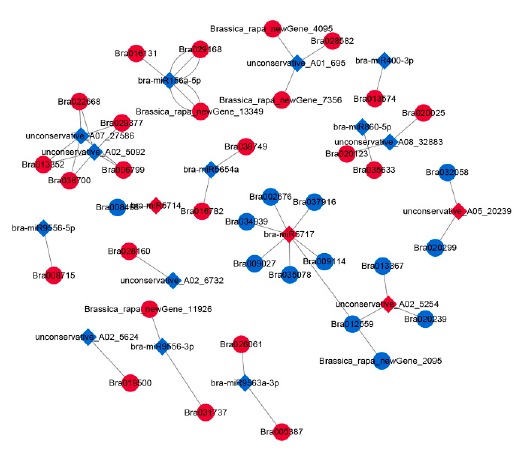作者使用了TargetFinder來預(yù)測(cè)miRNA的靶基因,結(jié)合差異分析的結(jié)果最終得到170對(duì)miRNA和基因的調(diào)控關(guān)系,包含了18個(gè)miRNA和37個(gè)基因。對(duì)這些基因進(jìn)行GO富集分析,發(fā)現(xiàn)主要是細(xì)胞過程、代謝過程等功能。對(duì)構(gòu)建的網(wǎng)絡(luò)進(jìn)行研究發(fā)現(xiàn)miRNA所調(diào)控的基因主要是涉及糖代謝、脂質(zhì)代謝、花粉管生長等,同時(shí)也發(fā)現(xiàn)這些miRNA與植物激素相關(guān),比如bra-miR9556-5p可能通過靶向Bra008715來參與水楊酸介導(dǎo)的信號(hào)通路和油菜素類固醇生物合成過程途徑。