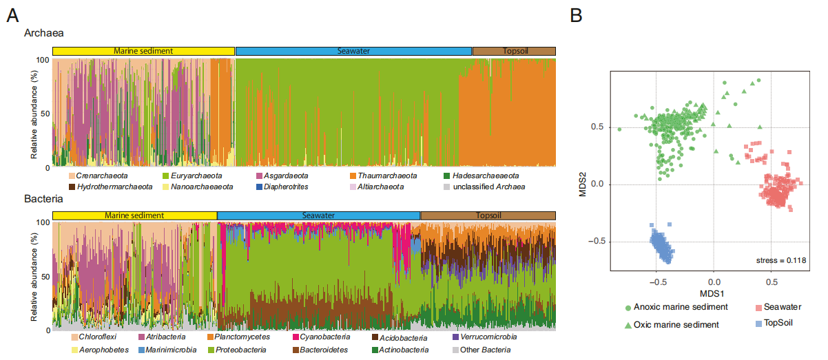 為了評估海洋沉積微生物群落與其他主要環(huán)境中微生物群落的關(guān)系,作者將海洋沉積物通用引物與使用相同通用引物的引物進行微生物群落分析的海水和表層土壤的已發(fā)表序列進行了比較。本研究中這三種生態(tài)環(huán)境的微生物群落中的細(xì)菌和古菌群落組成明顯不同(圖4)。如圖3所示,Crenarchaeota和Asgardaeota在海洋沉積物中占優(yōu)勢,而Euryarchaeota和Thaumarchaeota在海水中占優(yōu)勢,而Thaumarchaeota在表層土壤中占優(yōu)勢。細(xì)菌群落組成表明變形桿菌在表層土壤和海洋中占據(jù)優(yōu)勢。此外,Cyanobacteria,Marinimicrobia和Bacteroidetes在海水中占主導(dǎo)地位,而Acidobacteria和Verrucomicrobia在表層土壤中更為重要。在海洋沉積物中普遍存在著Atribacteria和Aerophobetes,但其他兩個環(huán)境中卻沒有這些細(xì)菌,這表明海洋沉積微生物構(gòu)成了一個獨特的生物群落。ASV組成的樣品間相似性表明這三個生物群落中的群落不同(圖4B),海洋沉積物中樣品間的多樣性更高。與其他環(huán)境相比,這種高多樣性可能反映了海洋沉積物棲息地條件的劇烈變化。