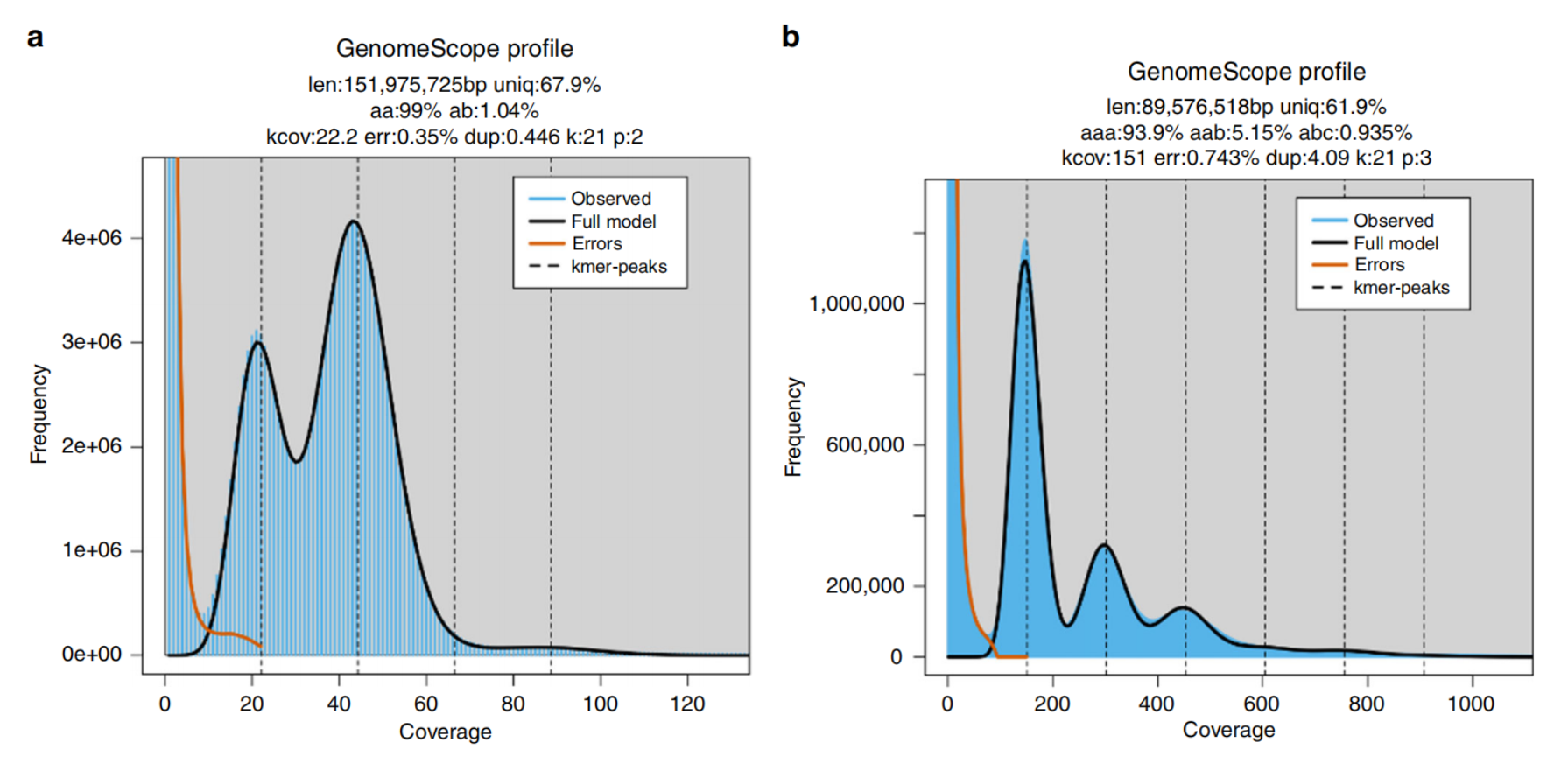 ? ? ? ?但僅知道物種大小是遠遠不夠的,現(xiàn)在為了完成更高質(zhì)量基因組組裝通常需要選擇不同類型的材料。例如為了構(gòu)建0?Gap的高連續(xù)性基因組,會選擇超高純合度的材料(通過自交純合或是花藥培養(yǎng)等)來降低組裝中的障礙。亦或是為了完成二倍體基因組雙單倍體的組裝,選擇超高雜合度的材料(例如遠緣雜交或是野生材料篩選等)來增加基因組中同源對的差異,從而進行區(qū)分與組裝。