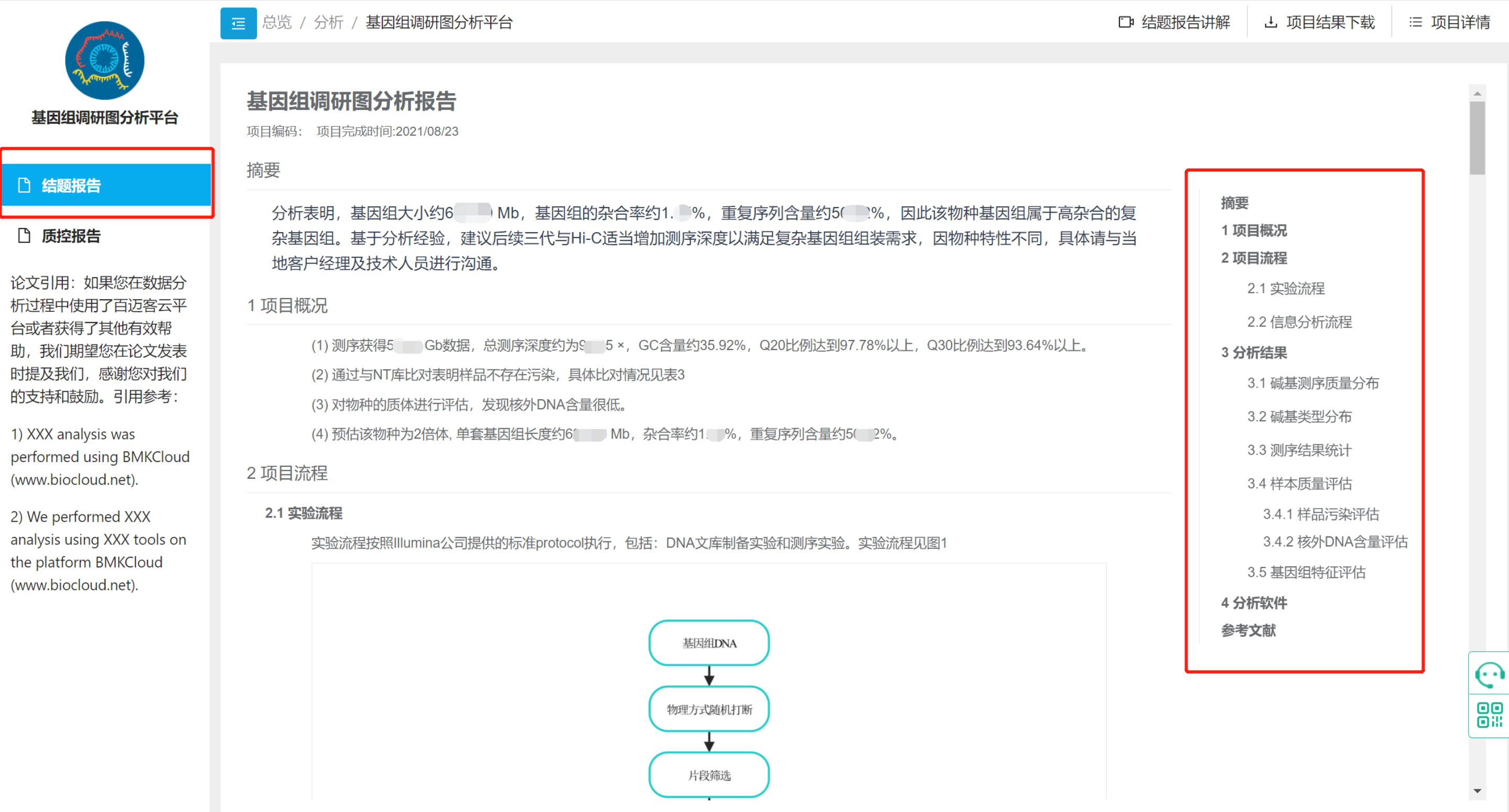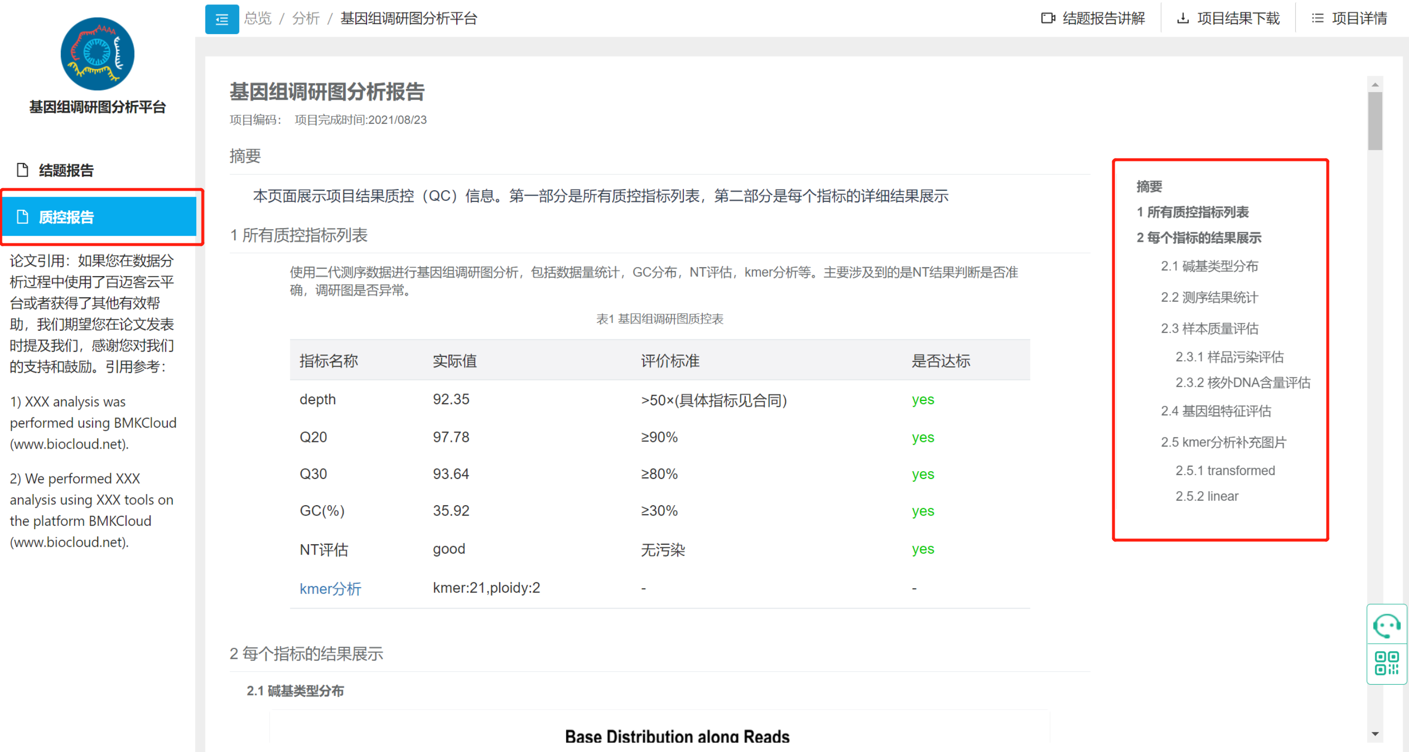 分析完成即可在線查看項目結(jié)題報告與數(shù)據(jù)質(zhì)控報告。報告將對整體數(shù)據(jù)質(zhì)量、污染評估、基因組特征、使用軟件版本等進行詳細描述。具體可見下圖右部目錄。