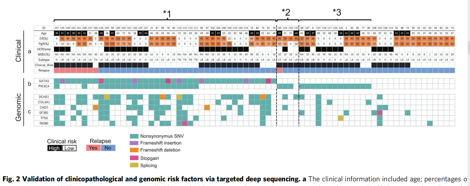 為了確定所識(shí)別的高危標(biāo)記物的分子病因,調(diào)查了另外三名具有代表性的新鮮冰凍標(biāo)本患者。患者A患有帶有GATA3突變(圖2,*1)和微侵襲的DCIS,病變被認(rèn)為是真正的DCIS?;颊連患有PgR低表達(dá)的DCIS(圖2,*2)和微侵襲,病變被視為真正的DCIS?;颊逤患有PIK3CA突變的DCIS(圖2,*3),沒(méi)有任何微侵襲,病變被認(rèn)為可能是假DCIS(低風(fēng)險(xiǎn)DCIS)。