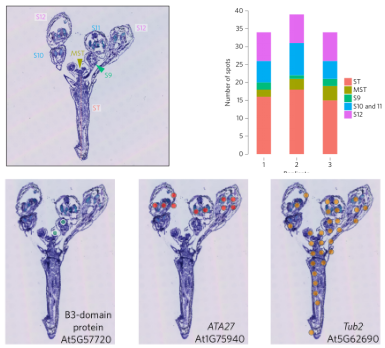 擬南芥花苞中空間轉(zhuǎn)錄組檢測莖、分生組織、以及3個(gè)不同花區(qū)域空間基因表達(dá),一共檢測到20215個(gè)基因,鑒定開花有關(guān)的兩個(gè)關(guān)鍵基因At5g57720(已知的在S3和S9表達(dá)的基因)和 ATA27 (At1g75940,已知的在S11和S12表達(dá)的基因)的√確的空間定位可視化,組織區(qū)域特異性基因和通路的顯著差異,發(fā)現(xiàn)雄蕊絲發(fā)育通路在S11(雄蕊絲伸長的位置)和莖中富集,在莖中維管通道大量存在,并且細(xì)胞伸長和維管發(fā)育過程非?;钴S。其中花粉外壁形成途徑在S10和S11發(fā)生改變,在這個(gè)階段,外壁是花粉壁的主要組成部分之一,在絨氈層產(chǎn)生并沉積在花粉前細(xì)胞上。空間基因表達(dá)特征揭示了組織區(qū)域異質(zhì)性,并為植物生長發(fā)育過程和相應(yīng)功能的探索提供了高分辨率的空間植物基因表達(dá)模式,從新的維度探索植物發(fā)育過程。