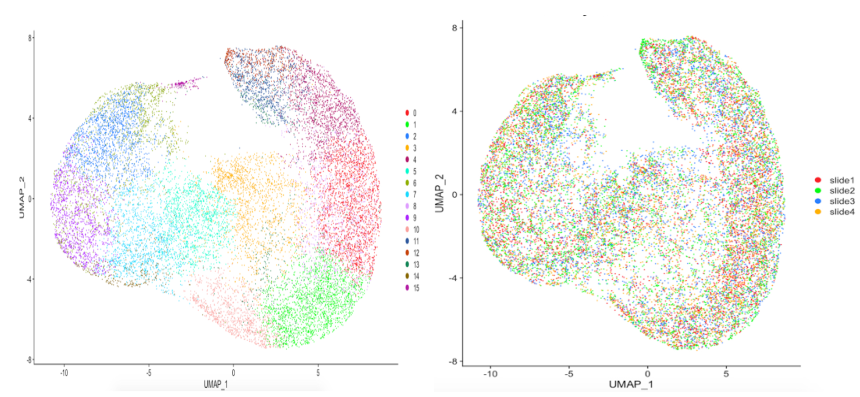 UMAP對樣本進(jìn)行批次效應(yīng)分析,可視化展示16個(gè)樣本空間基因表達(dá)聚類可視化圖。