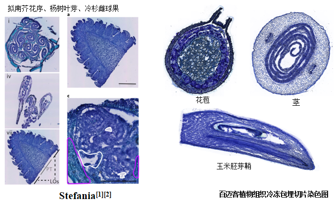 動物組織常用HE(蘇木精-伊紅染色法 ( hematoxylin-eosin staining ))染色,可以精準(zhǔn)識別組織形態(tài)和病理學(xué)鑒定。然而植物的組織存在的纖維素和一些木質(zhì)素不適合HE染色方法,采取的是甲苯胺藍(lán)染色法,其基本原理是植物組織木質(zhì)化細(xì)胞壁呈藍(lán)綠色,其他組織成分呈紫藍(lán)色,可以精準(zhǔn)輔助判斷植物組織形態(tài)學(xué)和確定捕獲區(qū)域。