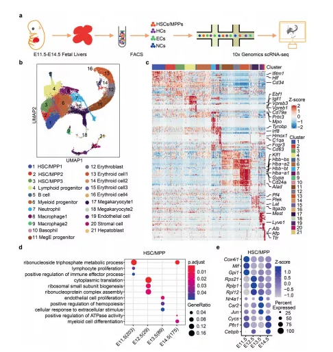 a FL組織的scRNA-seq 實(shí)驗(yàn)流程示意圖。b FL中所有單細(xì)胞的UMAP可視化。c熱圖顯示每個(gè)細(xì)胞簇前20個(gè)DEGs的表達(dá)模式。d在 FL 發(fā)育過程中,HSC/MPP 中富集的 GO通路。e FL發(fā)育過程中 HSC/MPP 中富集的 DEGs的散點(diǎn)圖。