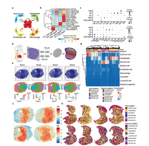 a示意圖展示 HSC/MPP 和生態(tài)位細(xì)胞(內(nèi)皮細(xì)胞、基質(zhì)細(xì)胞、成肝細(xì)胞和巨噬細(xì)胞)之間的細(xì)胞相互作用。b CellPhoneDB 分析展示主要的 HSC/MPP-生態(tài)位細(xì)胞相互作用對。c主要的HSC/MPP-生態(tài)位細(xì)胞相互作用對的配體(頂部)和相應(yīng)受體(底部)表達(dá)模式的散點(diǎn)圖。d 10×Visium ST 實(shí)驗(yàn)流程示意圖。e E14.5 胚胎組織切片的蘇木精和伊紅 (HE) 染色。f組織切片中成肝細(xì)胞標(biāo)記物Afp 的表達(dá)模式。g熱圖展示了FL斑點(diǎn)的富集分?jǐn)?shù)。h FL部分空間特征圖。