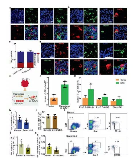 a免疫熒光分析顯示 E14.5 FL 冷凍切片中 F4/80(代表巨噬細(xì)胞)和 c-Kit(代表 HSCs/MPPs)的表達(dá)。b免疫熒光分析顯示 E14.5 FL 冷凍切片中 F4/80(代表巨噬細(xì)胞)和 Runx1(代表 HSCs/MPPs)的表達(dá)。C柱狀圖展示有和無細(xì)胞相互作用的 HSCs/MPPs 的比例。d免疫熒光分析顯示 E14.5 FL 冷凍切片中 F4/80(代表巨噬細(xì)胞)、CD150(代表 HSCs/MPPs)、Mecom(代表 HSCs/MPPs)和 Hlf(代表 HSCs/MPPs)的表達(dá)。f源自巨噬細(xì)胞和 HSC/MPP 共培養(yǎng)系統(tǒng)的 HSCs/MPPs(LSK 細(xì)胞)的數(shù)量。g源自MDK補(bǔ)充培養(yǎng)物的 100 個(gè) HSCs/MPPs(LSK、Flt3 -LSK 和 SLAM-LSK 細(xì)胞)的HSCs/MPPs(LSK 細(xì)胞)的數(shù)量。h氯膦酸鹽-脂質(zhì)體和對照-脂質(zhì)體處理后 E14.5 FL 中的總細(xì)胞數(shù)。i氯膦酸鹽處理前后 E14.5 FL中譜系- (Lin- ) 細(xì)胞的比例。j氯膦酸鹽處理前后 E14.5 FL 中 LSK 細(xì)胞的比例。k氯膦酸鹽處理前后 E14.5 FL 中 SLAM-LSK 細(xì)胞的比例。l流式細(xì)胞儀分析顯示E14.5 FL在氯膦酸鹽處理前后Lin -,LSK,SLAM-LSK的細(xì)胞比例。