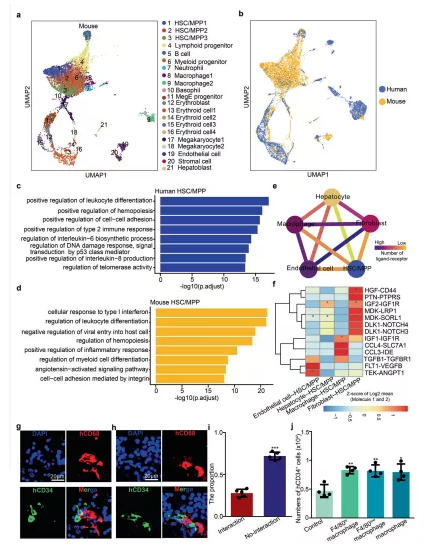 a E14.5 FL中所有細(xì)胞類型的UMAP 可視化。b來自小鼠(E14.5)和人類(受孕后 11 周)的 FL 細(xì)胞群的 UMAP 可視化。c對人類 HSCs/MPPs中top DEG 進(jìn)行 GO 生物過程相關(guān)的通路富集分析。d對小鼠 HSCs/MPPs 中top DEG進(jìn)行GO生物過程相關(guān)的通路富集分析。e配體-受體相互作用網(wǎng)絡(luò)展示了人 HSC/MPP與生態(tài)位細(xì)胞之間的潛在通訊網(wǎng)絡(luò)。f熱圖展示主要的人 HSCs/MPPs-生態(tài)位細(xì)胞相互作用對。g – h免疫熒光分析展示CD68(代表巨噬細(xì)胞)和 CD34(代表 HSCs/MPPs)在人受孕后第 11 周 FL 切片中的表達(dá)。i柱狀圖展示有和無細(xì)胞相互作用的 HSCs/MPPs 所占的比例。j源自小鼠巨噬細(xì)胞和 HSCs/MPPs 共培養(yǎng)系統(tǒng)的人 CD34 + HSCs/MPPs的數(shù)量。