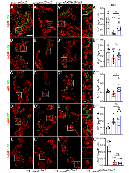 通過β-gal(lacZ等位基因的表達(dá))染色,觀察到Insm1delSNAG突變體的胰腺在E18.5時胰島素陽性β細(xì)胞數(shù)量減少,但是沒有像Insm1 null突變小鼠中那么嚴(yán)重(圖1A–A”’)。與對照相比,在Insm1delSNAG或Insm1中沒有觀察到α細(xì)胞數(shù)有變化(圖1B)。同時發(fā)現(xiàn)和對照相比,在Insm1delSNAG和Insm1-null突變體中觀察到PP數(shù)量的增加和δ細(xì)胞的減少(圖1D和E)。然而與對照小鼠相比,Insm1delSNAG突變體中生長抑素陽性的δ細(xì)胞數(shù)量顯著增加,且在Insm1-null突變體中細(xì)胞數(shù)減少了(圖1C–C”)。