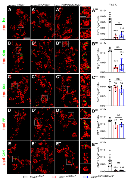 為了確認(rèn)這些減少現(xiàn)象是否發(fā)生在早期發(fā)育階段(即E15.5),檢測了胰腺E15.5的內(nèi)分泌系統(tǒng)。結(jié)果與對照相比,Insm1delSNAG和Insm1-null突變體中在觀察到一個類似的減少現(xiàn)象,包括胰島素,胰高血糖素,PP-和饑餓素陽性細(xì)胞(圖2)。然而,生長抑素陽性細(xì)胞的數(shù)量在Insm1delSNAG或Insm1-null突變體中都沒有發(fā)生改變(圖2C–C”)。因此,Insm1delSNAG突變體中δ細(xì)胞數(shù)量的增加發(fā)生在E18.5,而不在E15.5。