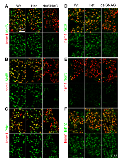 本研究的目的是確定Insm1的SNAG域在胰腺內(nèi)分泌細(xì)胞的發(fā)育中的特異功能。特別是分析了Insm1delSNAG/lacZ(Insm1delSNA突變體),Insm1lacZ/lacZ (Insm1 null突變體)和Insm1+/lacZ(對照) 同窩出生小鼠胚胎的免疫熒光。