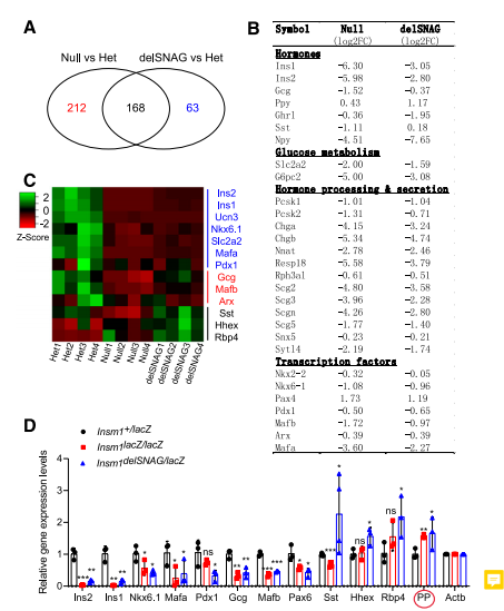 選用E18.5時Insm1delSNAG,Insm1 null和對照組小鼠的胰腺,利用RNA-seq研究Insm1delSNAG突變體胰臟內(nèi)的特異性基因表達(dá)。分析發(fā)現(xiàn)在Insm1delSNAG突變體胰腺中,共有231個基因顯著失調(diào),這些基因涉及發(fā)育和激素分泌方面。同時發(fā)現(xiàn)Insm1delSNAG和null 突變有顯著的差異基因交集,尤其是編碼激素的基因和與葡萄糖代謝和分泌調(diào)節(jié)相關(guān)的基因(圖5A、B)。Insm1delSNAG突變體中大約72.7%的差異基因也在Insm1 null突變體中被檢測到。然而與Insm1delSNAG突變體相比,Insm1 null突變體中有著更多的基因表達(dá)和數(shù)量上的變化。這些結(jié)果與在Insm1delSNAG突變體中發(fā)現(xiàn)比Insm1null突變體中β細(xì)胞更少這一現(xiàn)象一致。