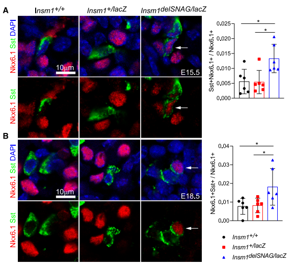 生長抑素和胰島素或胰高血糖素的復(fù)合染色很少被觀察到,且在Insm1delSNAG突變體和對照小鼠之間沒有發(fā)現(xiàn)差異。但是在E15.5和E18.5時Insm1delSNAG突變體中,檢測到Sst和β細(xì)胞特異性轉(zhuǎn)錄因子Nkx6.1的復(fù)合染色信號增強(qiáng)(圖6A、B)。Sst與Nkx6.1的共表達(dá)表明Insm1delSNAG中δ細(xì)胞有可能會從β細(xì)胞轉(zhuǎn)化而來。