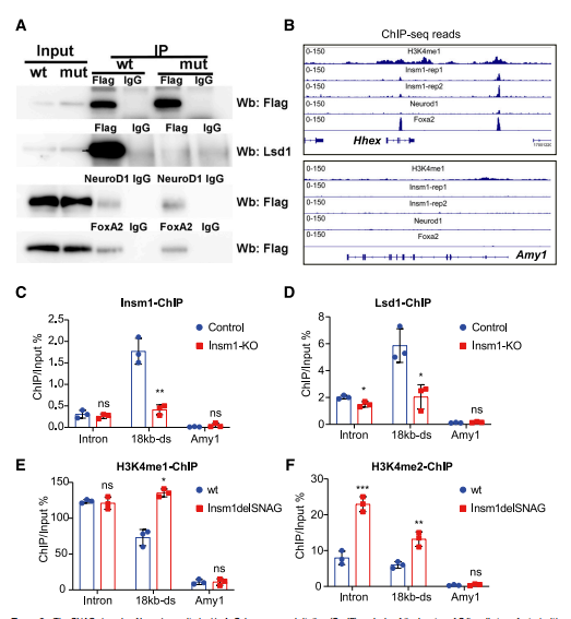 為了進(jìn)一步闡明Insm1的SNAG結(jié)構(gòu)域的分子功能,本研究通過免疫共沉淀法檢測與Insm1delSNAG相互作用的蛋白。本文檢測到Lsd1無法在轉(zhuǎn)染Insm1del-SNAG-Flag的SJb b細(xì)胞中被Flag抗體拉下來(圖8A)。這一結(jié)果與先前對垂體細(xì)胞的觀察結(jié)果一致。Insm1可以在胰腺β細(xì)胞中與NeuroD1和FoxA2互相作用。因此使用NeuroD1和FoxA2抗體在含有Insm1delSNAG-Flag或Insm1-Flag蛋白同一細(xì)胞裂解液中進(jìn)行免疫共沉淀,觀察到Insm1的SNAG域突變并沒有阻止Insm1與NeuroD1或FoxA2之間的相互作用(圖8A)。因此,Insm1delSNAG突變破壞了Insm1與Lsd1之間的相互作用,但不破壞Insm1與NeuroD1或FoxA2之間的相互作用。