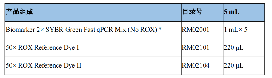 Biomarker 2× SYBR Green Fast qPCR Mix采用SYBR? Green I 嵌合熒光法進(jìn)行qPCR反應(yīng),通過(guò)對(duì)SYBR? / FAM通道進(jìn)行熒光信號(hào)定量檢測(cè),可以獲得PCR過(guò)程中DNA擴(kuò)增的真實(shí)數(shù)據(jù)。Taq DNA酶采用抗體法熱啟動(dòng)進(jìn)行擴(kuò)增,可以有效抑制引物退火導(dǎo)致的非特異性擴(kuò)增,極大地提高產(chǎn)品的特異性。且試劑盒中含有特殊的ROX Reference Dye,適用于所有qPCR儀器。