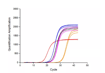 圖3:以1 μg不同物種的RNA為模板(紅色:人肝癌細(xì)胞;藍(lán)色:雞;黑色:斑馬魚(yú);紫色:水稻種子;黃色:番茄果),用BiomarkerScript Ⅱ 1st Strand cDNA Synthesis Kit進(jìn)行逆轉(zhuǎn)錄,得到cDNA產(chǎn)物。再以100 ng不同物種的 cDNA為模板,用Biomarker 2×SYBR Green Fast qPCR Mix進(jìn)行qPCR擴(kuò)增。