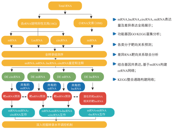 百邁客全轉(zhuǎn)錄組測(cè)序服務(wù)是一次檢測(cè),獲得四種分子(mRNA、lncRNA、circRNA、miRNA)信息,針對(duì)不同類型的RNA進(jìn)行表達(dá)分析,結(jié)構(gòu)研究以及全新轉(zhuǎn)錄本的發(fā)現(xiàn),并結(jié)合競(jìng)爭(zhēng)性內(nèi)源RNA(ceRNA)機(jī)制,進(jìn)行聯(lián)合分析,深入挖掘轉(zhuǎn)錄水平調(diào)控網(wǎng)絡(luò),深度探究各類RNA分子的調(diào)控機(jī)制。分析內(nèi)容如下:
