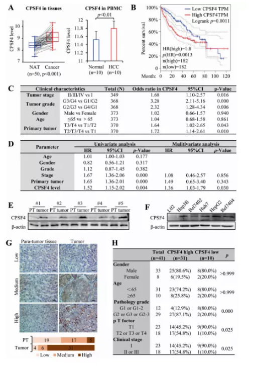 由于CPSF4表達(dá)在HCC中顯著增加,并且其高水平表達(dá)對(duì)應(yīng)于HCC中OS的最高風(fēng)險(xiǎn),因此本研究將重點(diǎn)放在CPSF4上。通過(guò)比較50對(duì)配對(duì)的序列數(shù)據(jù),發(fā)現(xiàn)HCC腫瘤組織中CPSF4表達(dá)水平顯著高于正常鄰近組織。來(lái)自GSE49515的微陣列數(shù)據(jù)還表明,10名HCC患者的外周血單核細(xì)胞(PBMC)樣本中的CPSF4水平顯著高于10名健康對(duì)照,這表明CPSF4可以作為HCC診斷的生物標(biāo)志物(圖 1A)。Kaplan-Meier對(duì)364例患者的生存分析顯示,5 年生存率從 CPSF4低表達(dá)患者的57%±5%下降到CPSF4高表達(dá)患者的42%±5%(p < 0.01,圖 1B)。進(jìn)一步的相關(guān)分析表明,CPSF4與臨床TNM分期、病理分級(jí)和臨床分期顯著相關(guān)(圖 1C)。單變量分析表明HCC患者的OS率與高CPSF4表達(dá)之間存在關(guān)聯(lián)(p < 0.01)。多變量Cox回歸分析顯示CPSF4水平(p = 0.03)是OS的獨(dú)立預(yù)后因素(圖 1D)。