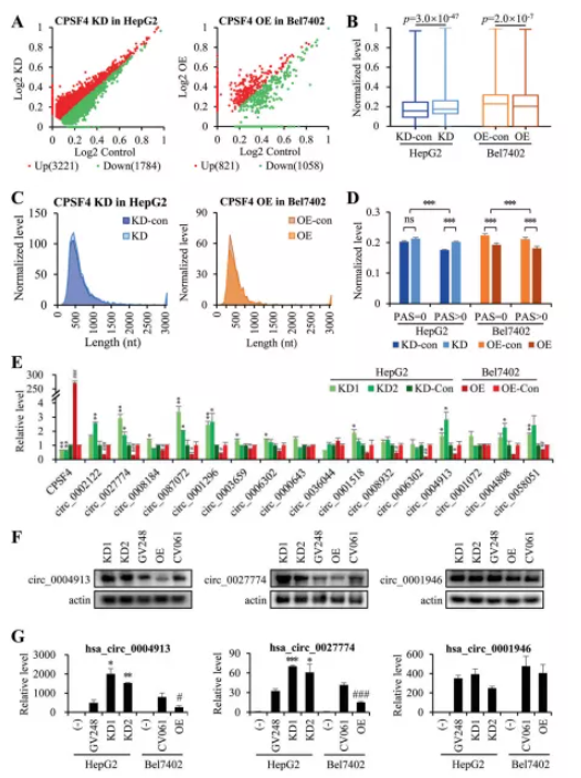 為了驗(yàn)證,本研究首先從GEO數(shù)據(jù)庫(kù)中選擇了HCC組織中807個(gè)下調(diào)的circRNA(FC>2,p<0.05);然后從RNA-seq數(shù)據(jù)中篩選了1447個(gè)在CPSF4-OE細(xì)胞中下調(diào)或在CPSF4-KD細(xì)胞中上調(diào)的circRNA。這兩組數(shù)據(jù)取交集,共得到24個(gè)circRNA作為驗(yàn)證的候選circRNA;結(jié)構(gòu)分析表明其中16個(gè)含有PAS序列。實(shí)時(shí)PCR結(jié)果顯示,這16個(gè)circRNA中有13個(gè)在CPSF4-OE細(xì)胞中被抑制,但在CPSF4-KD細(xì)胞中被激活(圖 2E)。選擇2個(gè)帶有PAS元件的circRNA,hsa_circ_0027774 和 hsa_circ_0004913 作為CPSF4靶向的circRNA;同時(shí),另一個(gè)廣泛研究的不含PAS元件的circRNA hsa_circ_0001946作為CPSF4非靶向circRNA。Northern blot結(jié)果表明hsa_circ_0027774和hsa_circ_0004913與CPSF4呈負(fù)相關(guān),但hsa_circ_0001946在所有細(xì)胞系中保持相同水平(圖 2F)。同時(shí)構(gòu)建了這三種circRNA的OE質(zhì)粒并與CPSF4 OE或KD質(zhì)粒共轉(zhuǎn)染,real-time PCR結(jié)果顯示帶有PAS的circRNA(hsa_circ_0027774和hsa_circ_0004913)與CPSF4水平呈負(fù)相關(guān),而不含PAS的circRNA(hsa_circ_0027774和hsa_circ_0004913)不受CPSF4的影響(圖 2G),這說(shuō)明CPSF4在轉(zhuǎn)錄后抑制了circRNA。總之,CPSF4直接調(diào)節(jié)HCC細(xì)胞中帶有PAS元件的circRNA的表達(dá)。