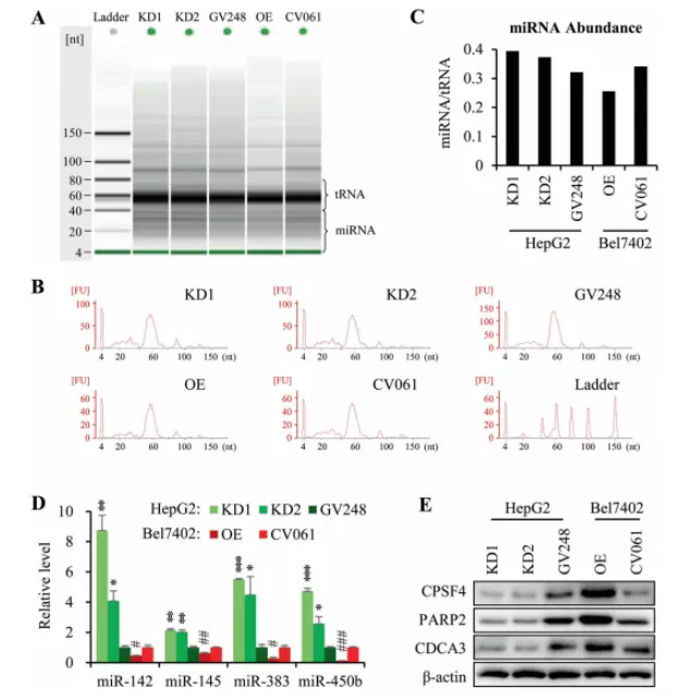 為了測(cè)試CPSF4介導(dǎo)的circRNA減少是否會(huì)影響miRNA的穩(wěn)定性,從CPSF4-OE和CPSF-KD細(xì)胞中提取總miRNA,結(jié)果顯示CPSF4-OE細(xì)胞中miRNA(4-40 nt)和tRNA(40-80 nt)的比率降低,但在CPSF4-KD細(xì)胞中增加(圖 3A-C),這證實(shí)了CPSF4能夠減少miRNA的積累。