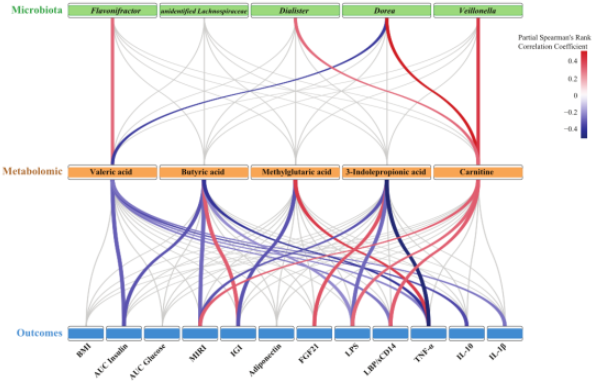 圖3.腸道菌群、共代謝物和葡萄糖穩(wěn)態(tài)、腸道健康和炎癥的生物標志物之間的相關性分析。