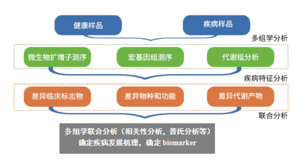 ?微生物組測序(主要指擴增子測序與宏基因組測序)可提供微生物組成、基因功能和豐度信息,而代謝組學是研究生物體中代謝產物變化的科學。生物科學研究過程復雜,單—組學往往無法全面的解決生物學問題,多組學就顯得尤為重要。近年來,隨著微生物組學研究的不斷發(fā)展和持續(xù)火熱,越來越多的研究者開始將微生物組學和代謝組學聯合起來,從物種、基因以及代謝產物等水平共同解釋科學問題,更好地理解疾病過程及機體內物質的代謝途徑,還有助于發(fā)現疾病的生物標記以更進—步應用千臨床輔助診斷。