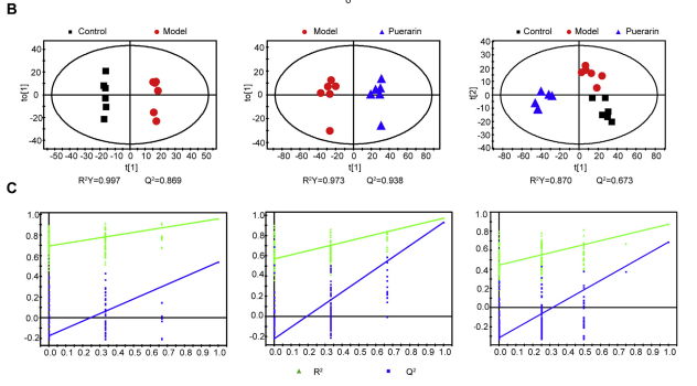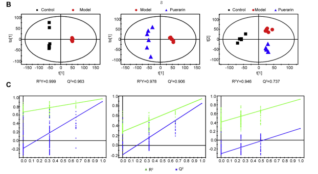 圖3A和圖4a顯示了小鼠肝臟組織和尿液的代表性1H NMR譜圖。為了研究NASH對小鼠代謝紊亂的影響,基于小鼠肝組織和尿液樣本的歸一化核磁共振波譜數(shù)據(jù),計(jì)算PCA和OPLS-DA模型,揭示葛根素的干預(yù)作用。觀察到對照組和模型組之間肝臟和尿代謝表型的清晰分離(圖3B, 4b和S1),表明MCD飲食誘導(dǎo)小鼠NASH后發(fā)生了一些顯著的生化變化。此外,PCA 和 OPLS-DA 得分圖揭示肝臟和泌尿代謝的完全分化模型和葛根素組之間的概況以及顯示葛根素組有恢復(fù)到健康對照組的趨勢,這可能歸因于葛根素對NASH的治療效果。兩個(gè)模型參數(shù)R2Y 和 Q2 以及置換測試的結(jié)果說明了OPLS-DA 模型的有效性(圖 3C 和 4C)。